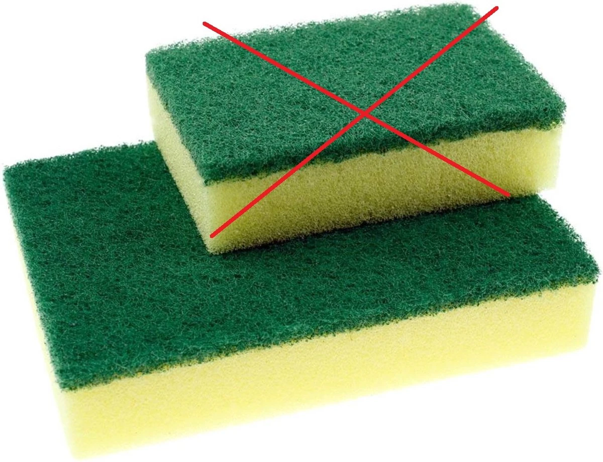 De groene schuurzijde is alleen te gebruiken op krasbestendige ondergronden.