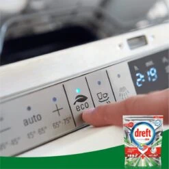 Dreft Platinum Plus All in One vaatwascapsules leveren een zo goed als nieuwe vaat. Ze leveren de beste reiniging van Dreft en helpen zelfs de dofheid die na verloop van tijd is opgebouwd weg te nemen om de oorspronkelijke glans van je vaat te herstellen. Dreft Platinum Plus heeft een geïntegreerd voorwassysteem en doet het voorwasprogramma voor je. Met Dreft Platinum Plus hoef je niet voor te spoelen, zodat je water bespaart en milieuvriendelijker bent. Dreft combineert vloeistof en poeder in één krachtige capsule. Het ultra-oplosbare zakje lost snel op en werkt goed in korte cycli omdat het snel begint te reinigen om de klus klaar te krijgen. En ze zijn gemakkelijk te gebruiken. Plaats ze gewoon in het doseerbakje van je vaatwasser, met verpakking.
