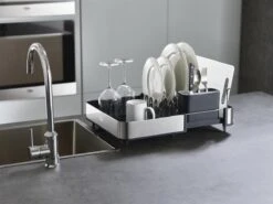 Dit handige Extend Steel afdruiprek van Joseph Joseph is ideaal voor zowel kleinere als grotere huishoudens, omdat hij uitschuifbaar is. Afhankelijk van de ruimte die je tot je beschikking hebt, kun je hem zo ver uitschuiven als nodig is. Het stalen rek is ideaal voor je glazen, mokken en borden en bevatten een speciale beschermende laag tegen het krassen. De basis van het afdruiprek is voorzien van ribbels zodat het water niet vast blijft zitten onder de vaat. Ook zorgt het ervoor dat het water naar een gootje wordt geleid waardoor het water zo weer de wasbak in druppelt. Dit gootje is, afhankelijk van de ruimte, heel gemakkelijk in 3 verschillende posities te draaien. Het afdruiprek bevat verder ook nog een bestekbak met speciale sleuven om scherpe messen in te zetten.