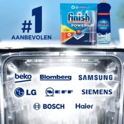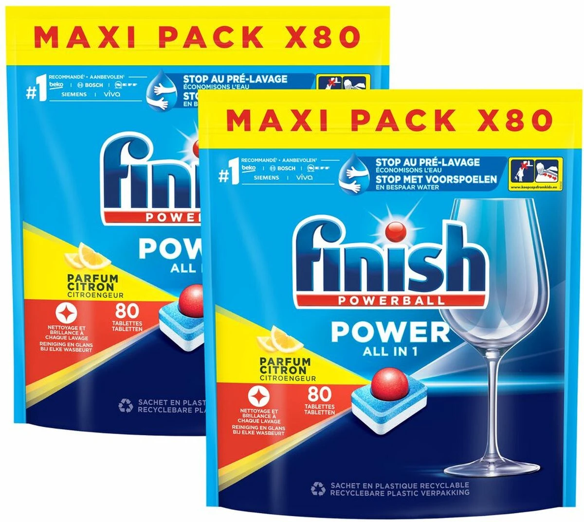 Deze verpakking bevat 2×80 Finish Power all in one citroen vaatwastabletten.