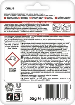 Het Glorix Citrus WC blok geeft elke spoelbeurt de kracht van Glorix Power 5, tot wel 300 spoelbeurten lang. Het product heeft diverse voordelen! Het reinigend schuim met anti-kalk werking houdt je toilet lang fris en zorgt bovendien voor glans en een hygiënische reiniging. Zo geniet jij dagelijks van een schoon toilet. De hanger is bovendien 100% recyclebaar! Gebruiksaanwijzing: – Vouw de hanger open. – Hang het toiletblok over de rand van het toilet, zodat het blok in contact komt met water bij het doorspoelen. – Als het toiletblok op is, weggooien in de vuilnisbak. – Was de handen na het aanraken.