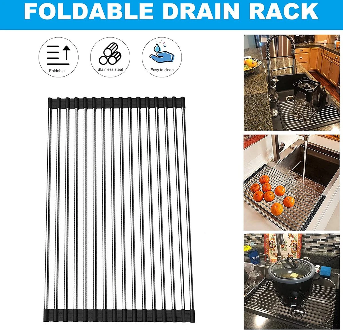 Het probleem met de meeste bordenrekken is dat ze ruimte in beslag nemen. Ons oprolbare afdruiprek heeft een flexibel ontwerp, het rolt op als een gootsteenmat en neemt minimale ruimte in beslag. Dit maakt hem ideaal voor elke keuken. Gemaakt van roestvrij staal en volledig bedekt met siliconen van voedingskwaliteit, waardoor het rek volledig slipvrij blijft. Het is hittebestendig tot 205 graden.
