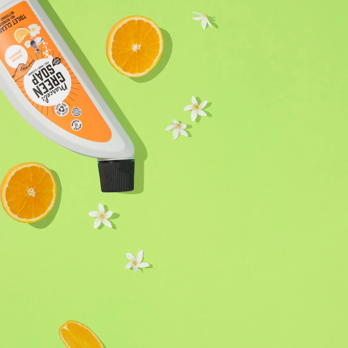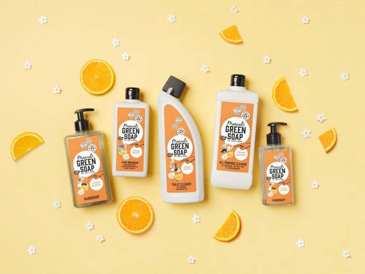 Marcel’s Green Soap toiletreiniger sinaasappel & jasmijn is gemaakt met natuurlijke ingrediënten, minstens 97% biologisch afbreekbaar en komt in een fles van 100% gerecycled plastic. Lekker duurzaam de pot op je zou ‘m bijna over het hoofd zien omdat ‘ie zo klein is – maar ook op het kleinste kamertje in huis valt winst te behalen. Veel reguliere schoonmaakmiddelen zoals toiletreiniger bevatten namelijk schadelijke stoffen voor het milieu. Daarnaast leveren ze ook nog eens een berg afval op. Niet nodig. Kies daarom voor de duurzame toiletreiniger en het duurzame toiletblok van marcel’s green soap, en maak van het kleinste kamertje in huis ook het groenste kamertje! duurzame toiletreiniger zoals alle producten van marcel’s green soap, bevat onze toiletreiniger geen kleurstoffen, parabenen, fosfaten, chloor, ammonia of zuren. Wél zit ‘ie bomvol natuurlijke ingrediënten, en is de toiletreiniger minstens 97% biologisch afbreekbaar. Hiermee is de toiletreiniger veilig te gebruiken, ook wanneer je een septic tank hebt. Sinaasappel & jasmijn jasmijn heeft een mysterieuze, bedwelmende toon, en schijnt ook een romantisch afrodisiacum te zijn. Als dat jouw relatie met schoonmaken niet versterkt! gelukkig voegt de sinaasappel hier de nodige nuchterheid en frisheid aan toe. We zijn hier tenslotte wel om schoon te maken…