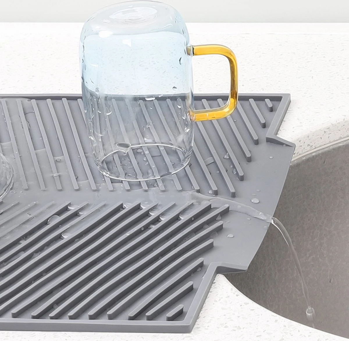 - AFVOER: Dankzij een afvoer aan de zijkant, zodat het overtollige water in je gootsteen kan weglopen, helpt deze siliconen mat om werkbladen van hout, vinyl en ander materiaal te beschermen tegen kromtrekken en watervlekken.