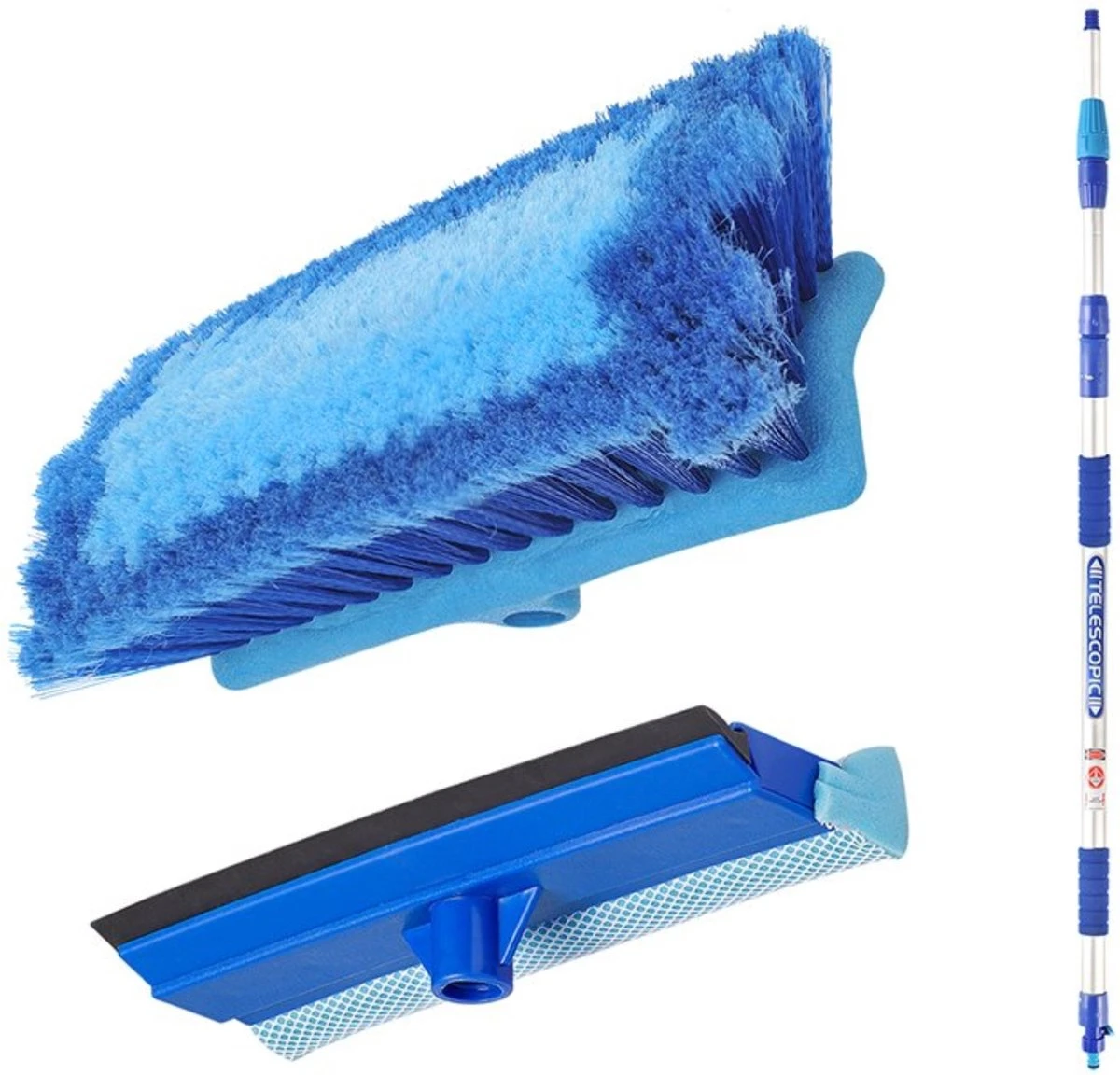 Deze wasborstel is ontworpen voor het zwaardere werk en is uitgerust met een telescopische steel die uitschuifbaar is tot 3 meter, waardoor je gemakkelijk bij moeilijk bereikbare plaatsen kunt komen. Het is ook uitgerust met een extra opzetstuk 2 in 1 raamtrekker 25cm en spons, waardoor je efficiënter kunt werken en tijd bespaart.